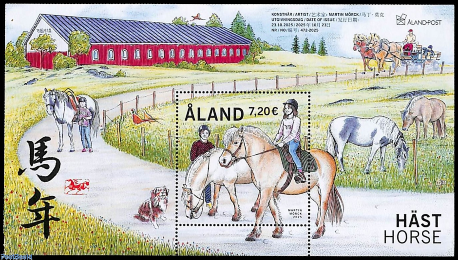 This miniature sheet from Åland captures horse life at an Åland stable. The inspiration for the edition is Stall JoY in the village of Samuelstorp in Hammarland, the only Åland stable to offer equine-assisted therapy for children and adults with functional disabilities.