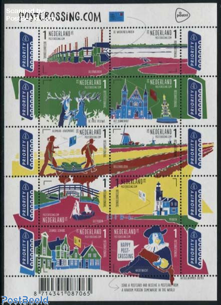 The Postcrossing 20th anniversary stamp sheet produced this year by The Netherlands consists of six identical stamps: three in a normal orientation and three inverted. An earlier postcrossing issue from The Netherlands in 2016 depicted typical Dutch scenes.