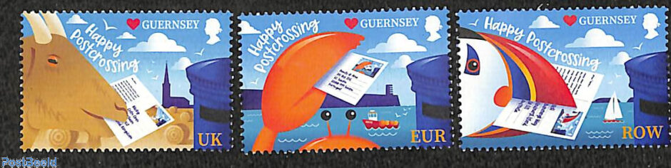 Guernsey issued three superbly designed postcrossing stamps in 2021 featuring a goat, a crab and a puffin about to place postcards in a letter box. They are intended separately for post within the United Kingdom, Europe and the Rest of the World.
