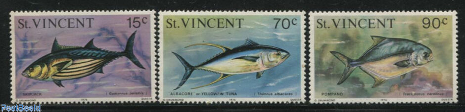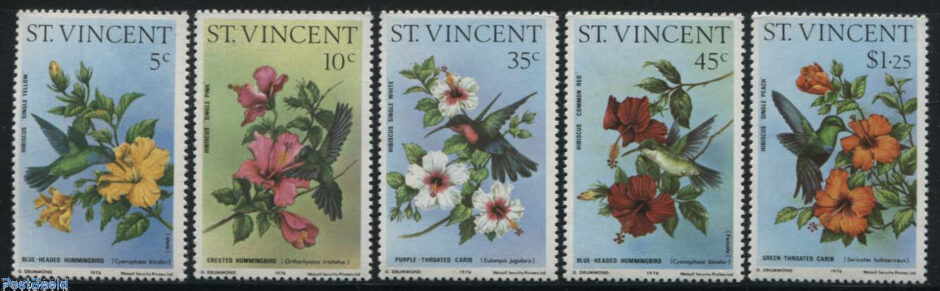 We begin with stamps from St. Vincent. Saint Vincent and the Grenadines lies to the west of Barbados, south of Saint Lucia and north of Grenada in the Windward Islands of the Lesser Antilles, in the Caribbean Sea. Above is a 5-value set featuring hummingbirds and different varieties of hibiscus flowers. Below three finely illustrated fish stamps from 1976 and a great set of definitives from 1975, also depicting a variety of fish.