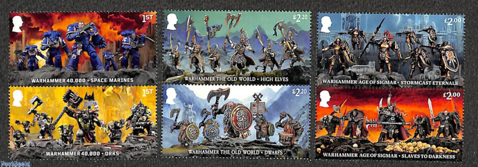 Part of Great Britain’s 2023 stamp issuance programme included the stamps seen above and below. Above, six stamps featuring the popular game/hobby Warhammer. Warhammer produces highly detailed miniatures figures that represent the characters and warriors of its settings. Hobbyists use the figures in various ways – by mustering an army for playing games, building and painting the miniatures to create their own scenarios.