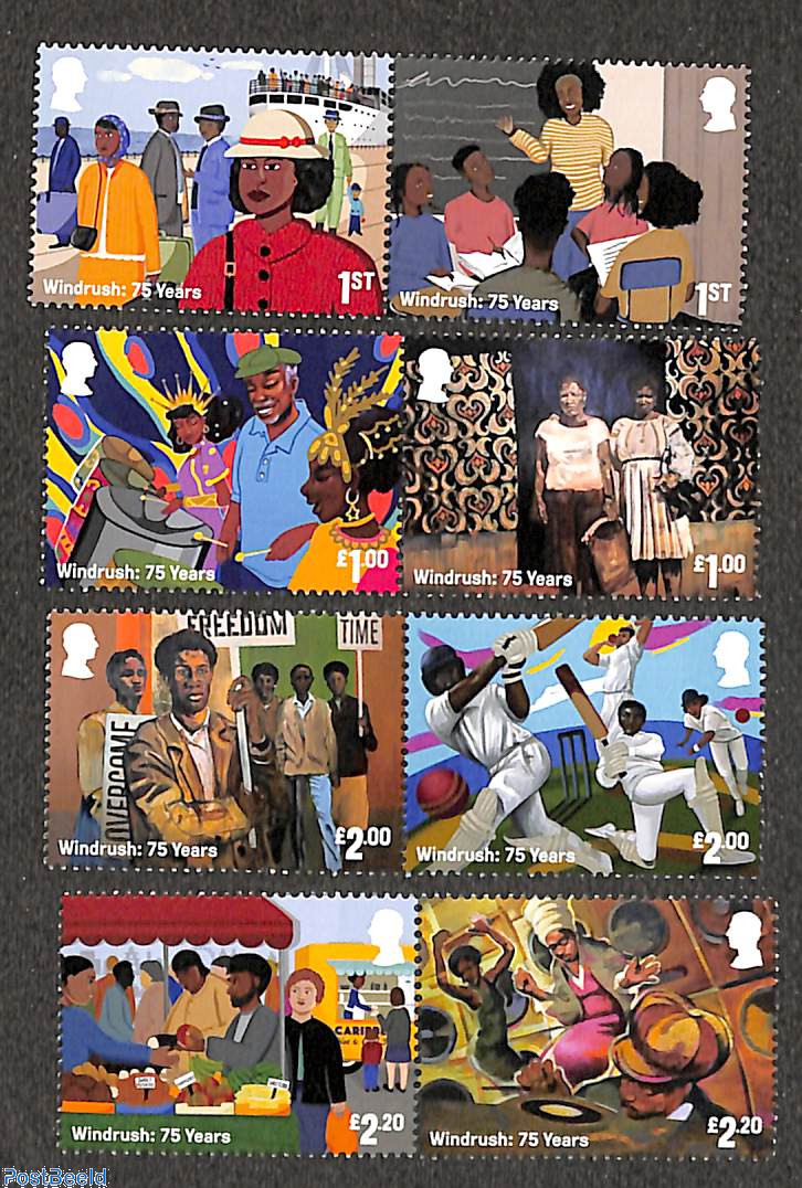 Superbly-created colourful graphics for the stamps commemorating the 75th anniversary of the arrival of the ship HMT Empire Windrush in England. The ship is best remembered today for bringing one of the first large groups of post-war West Indian immigrants to the United Kingdom. The ship carried 1,027 passengers and two stowaways on a voyage from Jamaica to London in 1948. Of these, more than 800 passengers gave their last country of residence as somewhere in the Caribbean. The Windrush’s arrival has become symbolic of the generation of British Commonwealth citizens who came to live in Britain between 1948 and 1971.