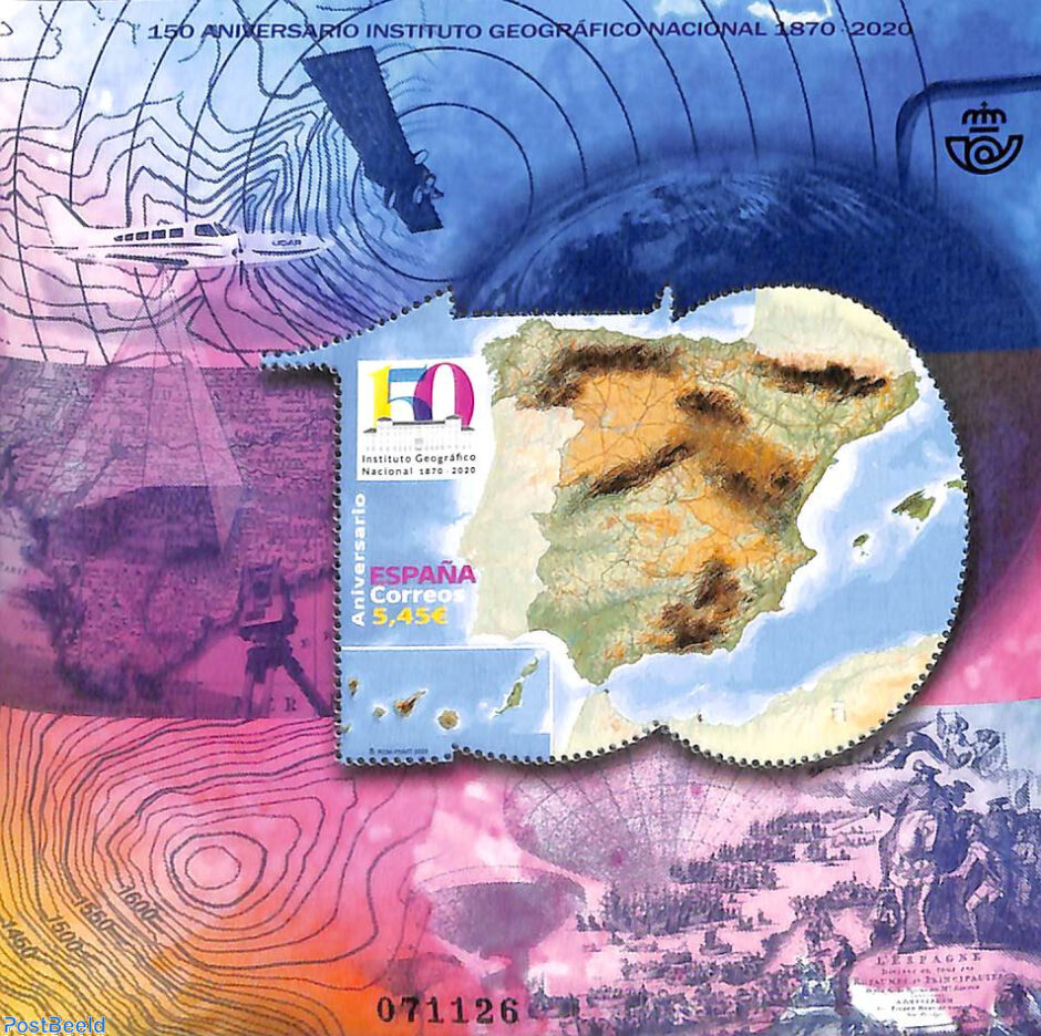 In 2020, the Spanish National Geographic Institute (IGN) celebrate its 150th anniversary. Since its creation on 12 September 1870, it has carried out 150 years of intense work – full of projects, ideas, tasks and results – always with the interest of society at heart, measuring and representing the world that surrounds us. Its work began by determining the shape and dimensions of the Earth, the production of maps and land registries, and management of the official weights and measurements system to end up including, in the twenty-first century, the most advanced technologies in the fields of Astronomy, Geodesy, Geophysics, Cartography and Geomatics. This beautifully designed stamp minisheet was issued to commemorate the anniversary.
